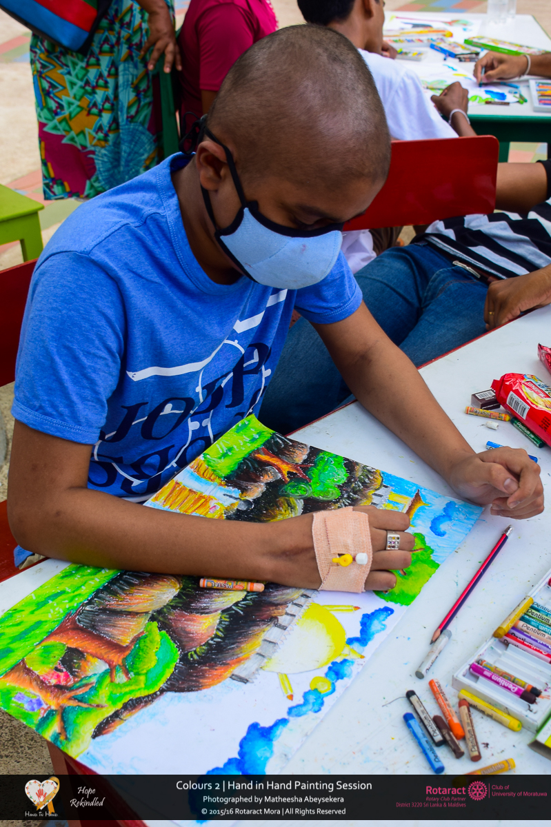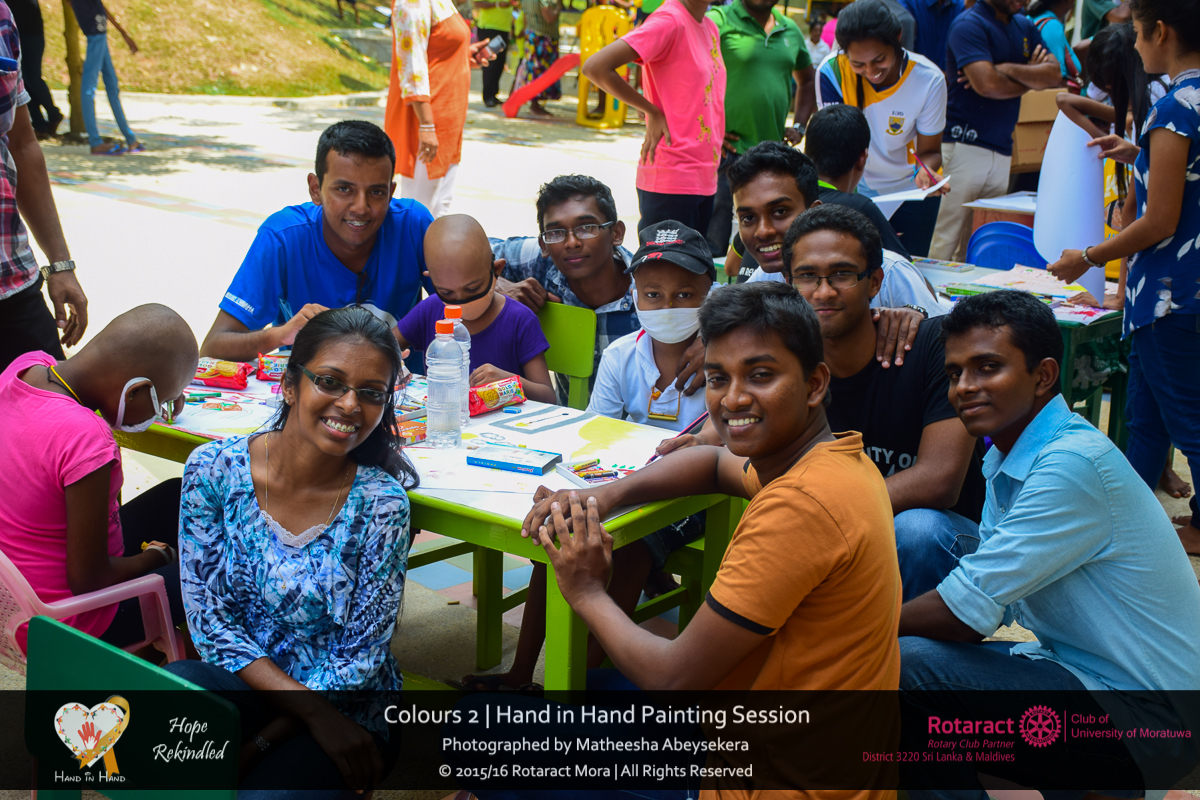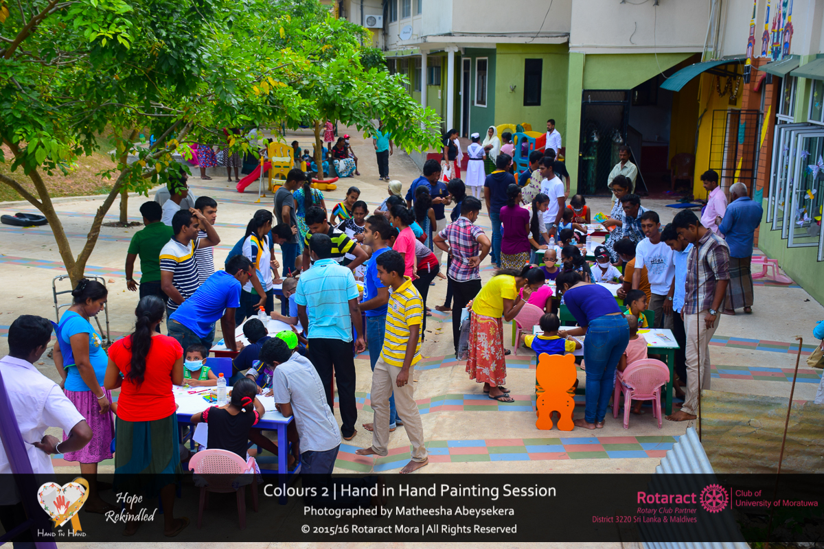 Hand in Hand was primarily focused on aiding the child cancer patients by providing monetary and non-monetary support to the Apeksha Hospital – Maharagama. This was reinforced by a painting session held on the 22nd March 2016 at the children play area of the hospital. More than 60 Rotaractors from Rotaract Club of University of Moratuwa spent the morning hours with the children suffering with cancer, drawing and painting arts. About 60 Children within the age group of 4-12 years were provided with stationary, pastel and other necessities needed for painting. A cheerful atmosphere was created by the Rotaractors who actively got involved with the kids throughout the session. At the end, gifts were distributed among the kids while promises were made to use some of the paintings to print Vesak cards to be sold during the Vesak Festival 2016. We have made Vesak card to be sold to raise funds in order to aid the hospital to give these children a hope; a hand they could hold on to; to be the light that will guide them out of the darkness. Simply a Hand in Hand.