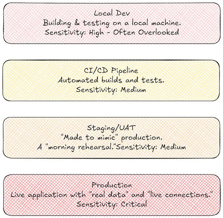 A secret’s value and handling must change as code moves from a laptop to a live server.