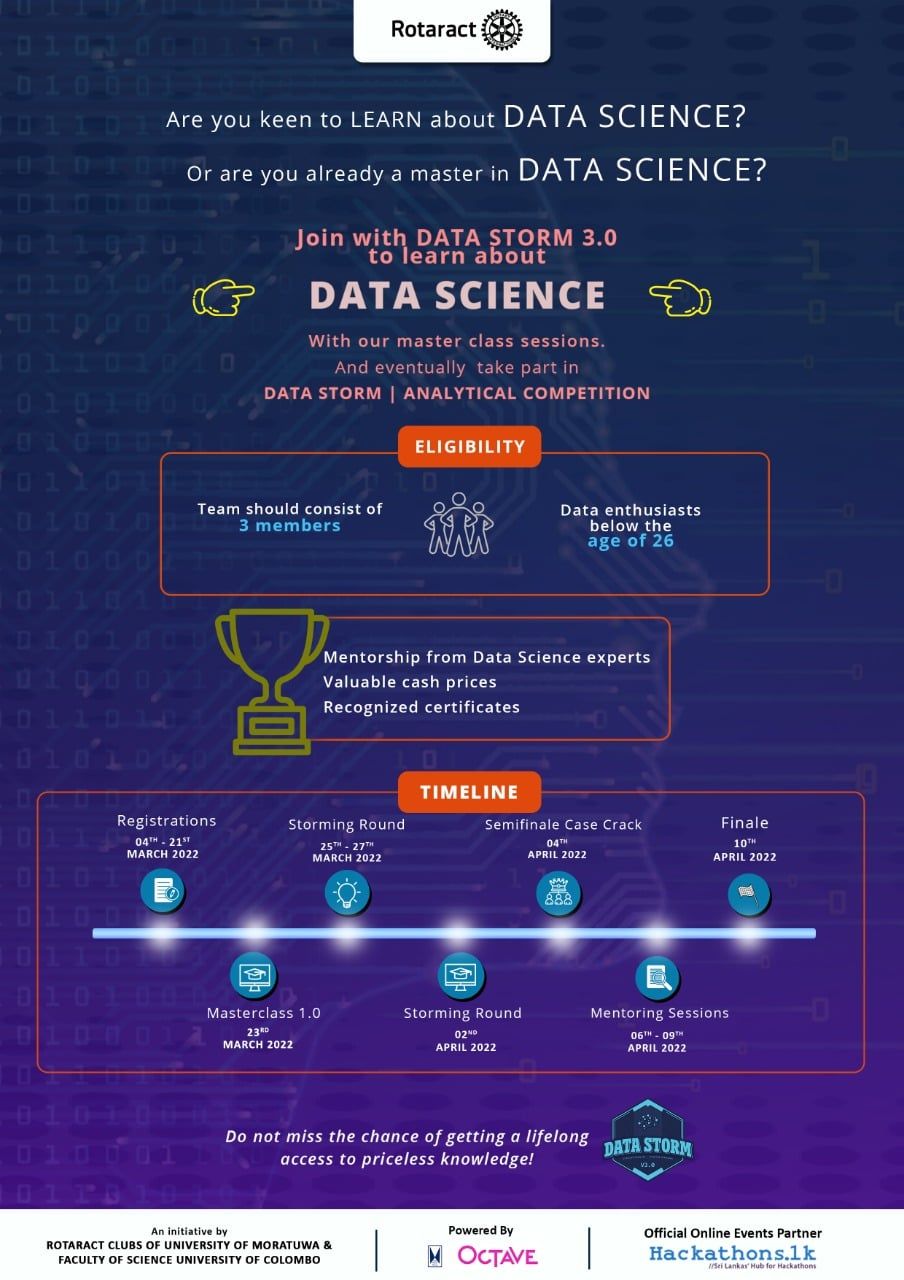Data Storm is back for the third consecutive year to allow young analytical minds to demonstrate their skills in the field of data analytics and enable industry experts to observe and assess the participants' potential. The unique feature of 'Data Storm,' and the reason it differs from traditional datathons, is that it demands participants to understand ways to deliver novel and feasible solutions to the given scenario, rather than only detecting patterns and links between the data presented. So this is the story of how Rotaract Club of University of Moratuwa and Rotaract Club of Faculty of Science University of Colombo put up the third episode of Sri Lanka’s Premier Advanced Analytics Competition - Data Strom.