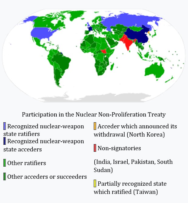 The Treaty on the Non-Proliferation of Nuclear Weapons (NPT), which entered into force in March 1970, seeks to inhibit the spread of nuclear weapons. Its 191 (With North Korea) states-parties are classified into two categories: nuclear-weapon states (NWS)—consisting of the United States, Russia, China, France, and the United Kingdom—and non-nuclear-weapon states (NNWS). Under the treaty, the five NWS commit to pursue general and complete disarmament, while the NNWS agree to forgo developing or acquiring nuclear weapons.
