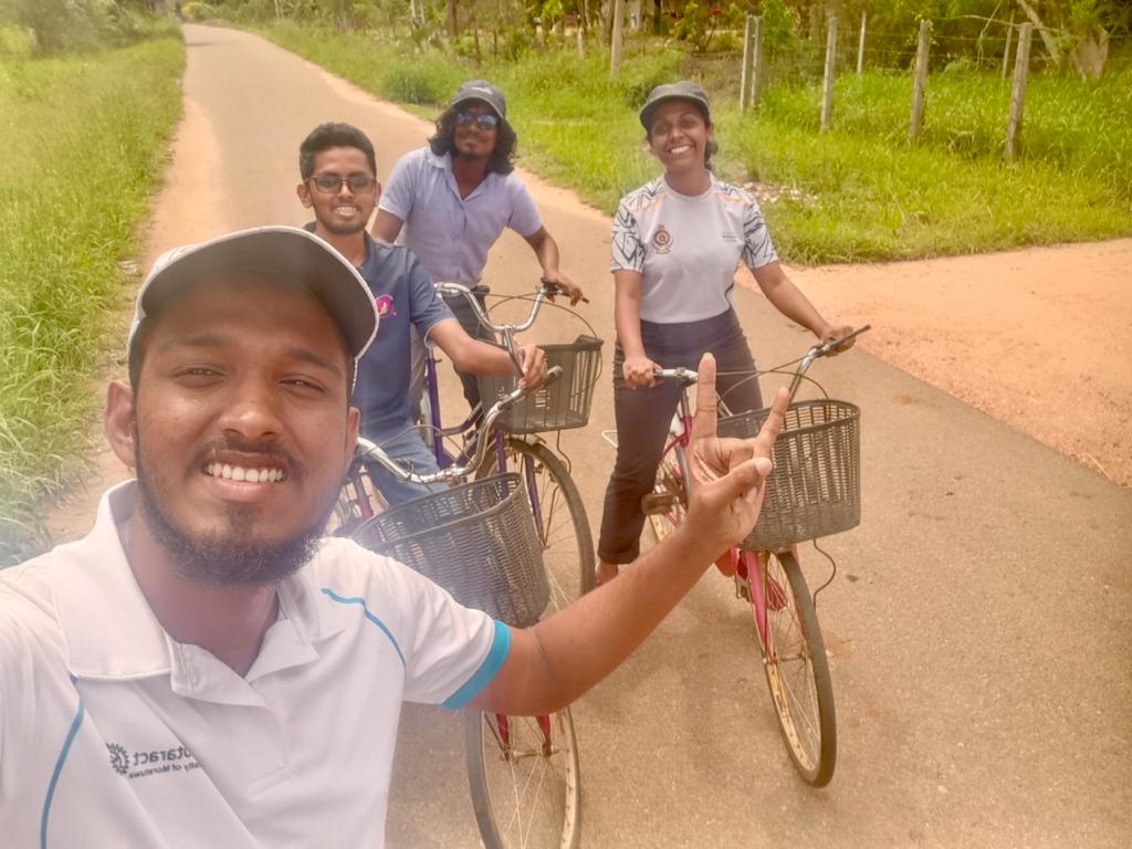 ඒ ගමනත් එතනින් ඉවර කරපු අපි ඊළඟට ගියේ ගමේ පන්සලට. පාසෙලෙන් ටිකක් දුර තිබුණු පන්සලට අපිට පාපැදි සවාරියක් යන්න අවස්ථාව උදා වුණා. ඉතින් කාලෙකින් බසියිකලේකට ගොඩ වුණ මමත් මිටින් හල කුරුල්ලෙක් සේ පාර දිගේ බයිසිකලෙ පදින්න පටන් ගත්තෙ අපිත් එක්ක ගමනට එකතු වුණ සවිති නංගිත් එක්ක තරඟයට. හැබැයි ඉතින් අනිත් දෙන්නට නං ඒ ගමන එච්චර සුන්දර එකක් වුණේ නෑ. කොහොමින් කොහොම හරි ගමේ පන්සලේ හාමුදුරුවොත් එක්කත් කතා බස් කරල ආපහු පාසලට ඇවිත් බයිසිකල් ටිකත් දීපු අපිට අකමැත්තෙන් වුණත් පාසලට සමුදෙන්න වෙලාව ඇවිත් තිබුණ. පාසලේ තිබුණ අඩුපාඩු මෙන්ම ගමේ තිබුණ අඩුපාඩුත් සටහන් කරගෙනම අපි කෙසේ හෝ මේ මල් කැකුළු වලට පිපෙන්නට සවියක් වෙනවාමයි යන අදිටනින් ආගන්තුක සත්කාර වලටත් ස්තූති කර ගෙනම ආපසු එන්න පිටත් වුණා.