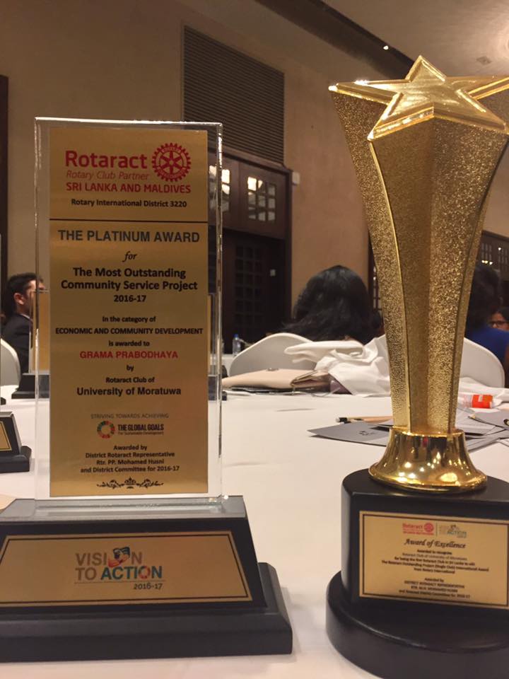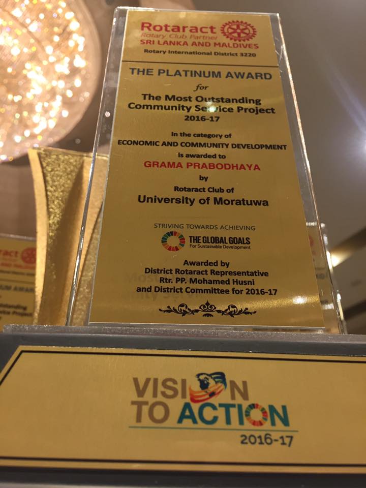 - Most Outstanding Community Service Project in the Category of ‘Economic and Community Development’ – Platinum Award – Grama Prabodhaya