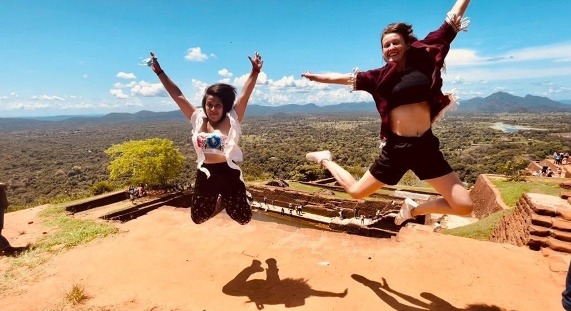 Presently started the first adventure of the day. The exhausting, yet rewarding climb of Sigiriya Rock Fortress. On that day, the scorching sun was not pitying us, so we were all sweaty when we reached the top of the rock. Yet, the view was breathtaking that all of our fatigue vanquished into thin air (which was not still, because of the high wind) while we stared awe - struck at it. Once we had satisfied ourselves enough of the view to remind ourselves that this was a perfect photo opportunity, started the photography session. I can still remember the struggle to capture Michelle and Laure jumping in unision with the scenic view stretching behind them.